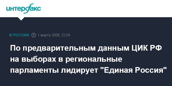 Москва. 1 марта. ИНТЕРФАКС - По предварительным данным, поступающим в ЦИК РФ, на выборах в региональные парламенты в рамках единого дня голосования лидирует партия "Единая Россия".