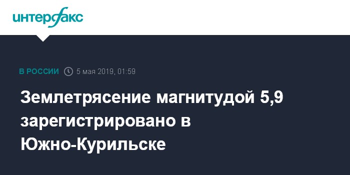 Москва. 5 мая. INTERFAX.RU - Землетрясение магнитудой 5,9 зарегистрировано в 101 км от Южно-Курильска магнитуда, глубина сейсмособытия составила 50 км, сообщает пресс-служба ГУ МЧС России по Сахалинской области.