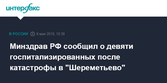 Москва. 6 мая. INTERFAX.RU - Девять человек госпитализированы после авиакатастрофы в аэропорту "Шереметьево" по состоянию на 10 утра понедельника, сообщает пресс-служба Минздрава России.