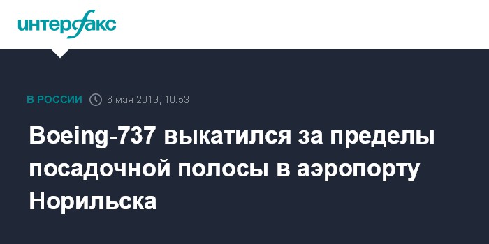Москва. 6 мая. INTERFAX.RU - Boeing-737, прилетевший в Норильск (Красноярский край) из Красноярска, выкатился за пределы взлетно-посадочной полосы, сообщается на официальном портале оперативной обстановки и прогноза ЧС Красноярского края; никто не пострадал.
