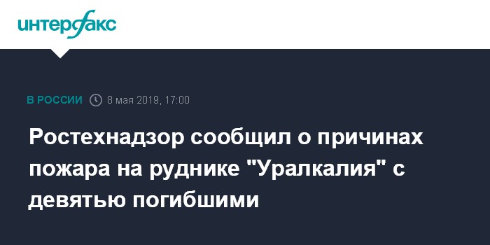 Москва. 8 мая. INTERFAX.RU - Ростехнадзор завершил техническое расследование пожара на руднике "Соликамск-3" (СКРУ-3) ПАО "Уралкалий", в результате которого в декабре 2018 года погибли девять человек.