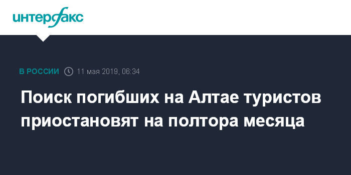 "11 мая в 8:00 мск планируется приостановить на 1,5 месяца поисковую операцию в горах Республики Алтай в районе Южно-Чуйского хребта. Это связано с тем, что существует угроза повторного схода лавины в месте поисков", - сказали в пресс-службе.