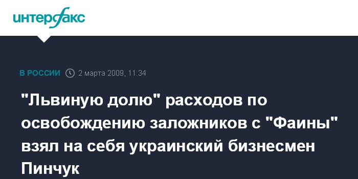 "В итоге львиную долю расходов - а это несколько миллионов долларов - на освобождение украинских моряков профинансировал предприниматель и меценат Виктор Пинчук. Это были его личные средства, которые он как основатель благотворительного фонда решил предоставить для того, чтобы освободить экипаж "Фаины", - подчеркнул глава президентского секретариата.