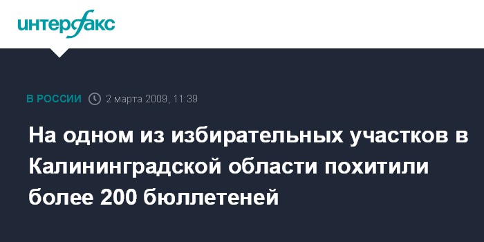 Москва. 2 марта. INTERFAX.RU - В Калининградской области во время выборов на одном из участков было похищено 255 бюллетеней, сообщил "Интерфаксу" в понедельник председатель областной избирательной комиссии Сергей Лунев.
