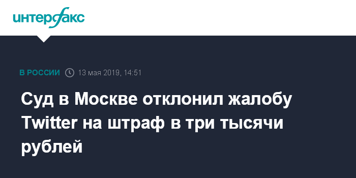 Москва. 13 мая. INTERFAX.RU - Таганский суд Москвы оставил без изменений решение мирового суда, который оштрафовал Twitter на три тысячи рублей за отказ предоставить информацию о локализации персональных данных российских пользователей сервиса на территории РФ, сообщили "Интерфаксу" в пресс-службе суда в понедельник.