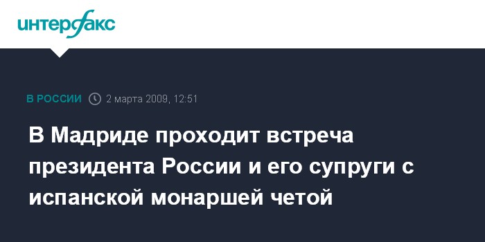 Москва. 2 марта. INTERFAX.RU - В мадридском дворце "Прадо" началась встреча президента России Дмитрия Медведева и его супруги Светланы с королем Испании Хуаном Карлосом I и королевой Софией.