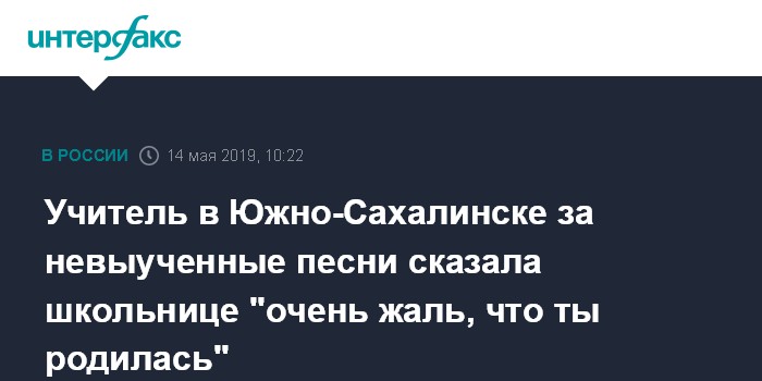 Москва. 14 мая. INTERFAX.RU - Прокуратура проводит проверку в школе N4 Южно-Сахалинска по появившейся информации об оскорблении ученицы педагогом во время урока, к которому девочка не выучила песни.