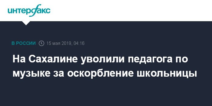 Москва. 15 мая. INTERFAX.RU - Учитель музыки общеобразовательной школы (СОШ) №4 Южно-Сахалинска, оскорбившая шестиклассницу за невыученные к уроку песни, уволена, сообщает в среду пресс-служба мэрии областного центра.