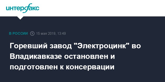 Москва. 15 мая. INTERFAX.RU - ОАО "Электроцинк" (Владикавказ) завершило подготовку к консервации и остановило все цеха.
