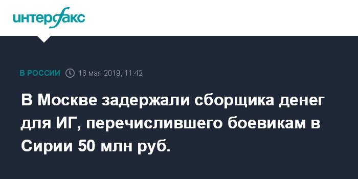 Москва. 16 мая. INTERFAX.RU - ФСБ сообщило о задержании в Москве подозреваемого в финансировании боевиков запрещенной в России организации ИГ, воюющих в Сирии.
