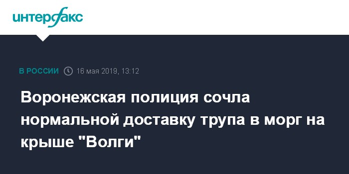 Москва. 16 мая. INTERFAX.RU - Покойника привезли в воронежский морг на крыше автомобиля "Волга", поскольку его родственники не нашли другого способа доставить тело на экспертизу, сообщили в четверг "Интерфаксу" в пресс-службе ГУ МВД по региону.