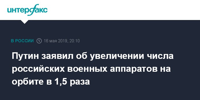 Москва. 16 мая. INTERFAX.RU - Российская орбитальная группировка космических аппаратов военного и двойного назначения за последние годы была обновлена практически на 80% и увеличена в 1,5 раза, сообщил президент РФ Владимир Путин.