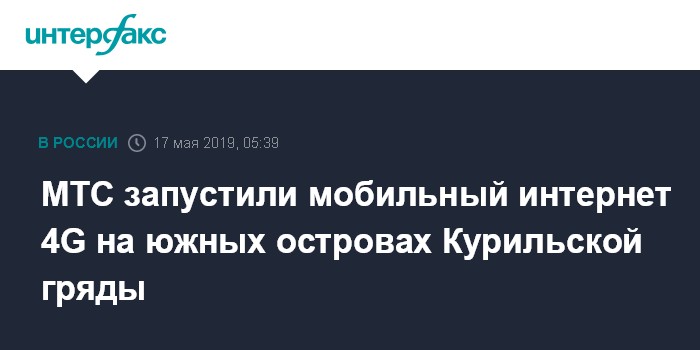 Москва. 17 мая. INTERFAX.RU - ПАО "Мобильные телесистемы" (МТС) в пятницу объявило о запуске мобильного интернета 4G со скоростью до 60 Мбит/с на южных островах Курильской гряды - Шикотане, Кунашире и Итурупе.