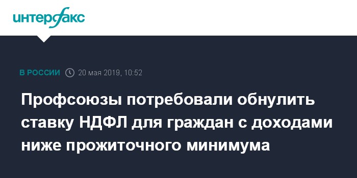 Москва. 20 мая. INTERFAX.RU - Федерация независимых профсоюзов России (ФНПР) настаивает на своем предложении свести к нулю ставку налога на доходы физических лиц (НДФЛ) для россиян с доходами ниже прожиточного минимума, заявил председатель ФНПР Михаил Шмаков.
