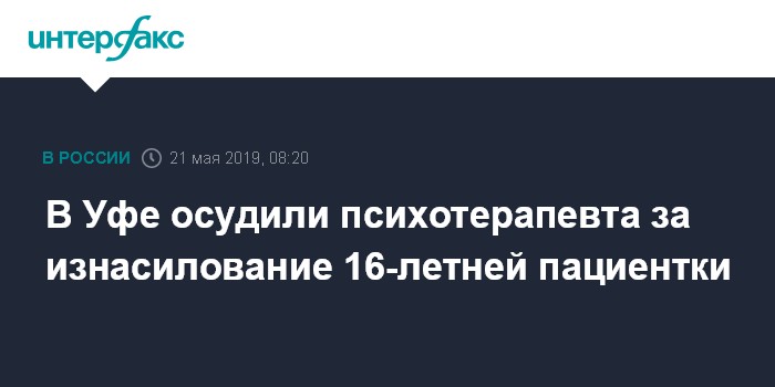 Москва. 21 мая. INTERFAX.RU - Суд вынес приговор уфимскому врачу по делу об изнасиловании 16-летней пациентки во время сеанса психотерапии, сообщает пресс-служба СУ СКР Башкирии во вторник.