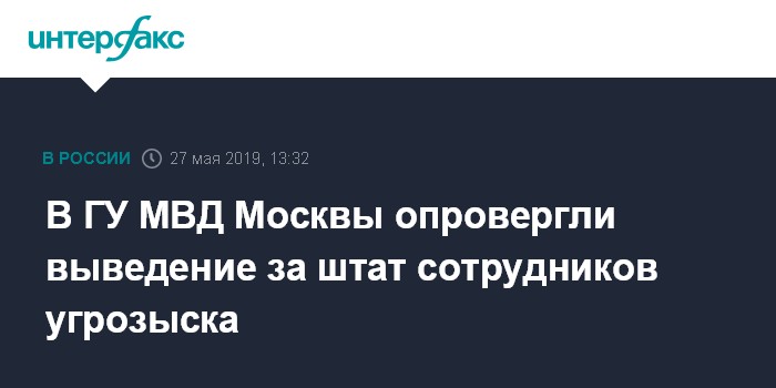 Москва. 27 мая. INTERFAX.RU - В ГУ МВД Москвы опровергают сообщения о том, что часть сотрудников уголовного розыска в управлении вывели за штат по итогам служебной проверки. Об этом заявили в пресс-службе главка.