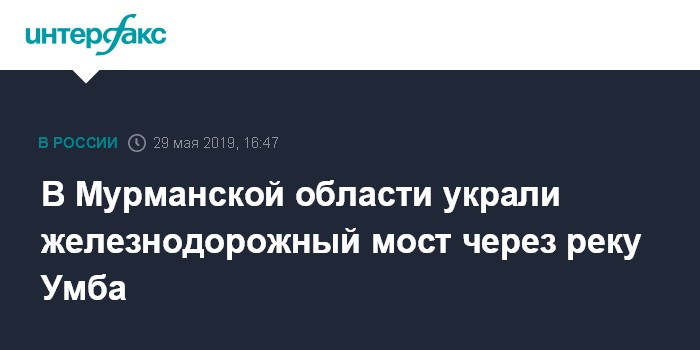Москва. 29 мая. INTERFAX.RU - В Мурманской области украли заброшенный железнодорожный мост через реку Умба у пустующего поселка Октябрьский. Полиция выясняет, кто был собственником конструкции, рассказала "Российской газете" представитель регионального управления МВД Валерия Филиппова.