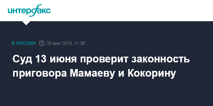Суд 13 июня проверит законность приговора Мамаеву и Кокорину