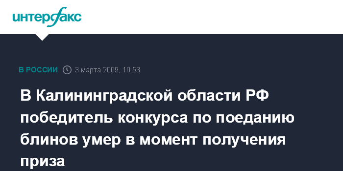 Москва. 3 марта. INTERFAX.RU - В городе Черняховск Калининградской области на праздновании Масленицы задохнулся и умер местный житель, выигравший конкурс по поеданию блинов на скорость.
