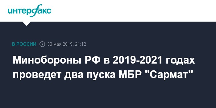 Москва. 30 мая. INTERFAX.RU - Минобороны РФ в 2019-2020 годах проведет два пуска межконтинентальной баллистической ракеты "Сармат" и три пуска тяжелой ракеты-носителя "Ангара-А5", следует из материалов портала госзакупок.