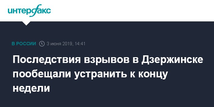 Москва. 3 июня. INTERFAX.RU - Восстановительные работы в Дзержинске, где в минувшие выходные произошел взрыв на оборонном заводе, собираются завершить к концу недели, сообщил в понедельник глава города Иван Носков.