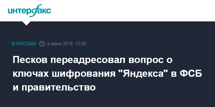 Москва. 4 июня. INTERFAX.RU - Информация о требовании ФСБ к "Яндексу" передать ей ключи шифрования переписки пользователей, не является темой Кремля. Об этом на брифинге 4 июня заявил пресс-секретарь президента Путина Дмитрий Песков.