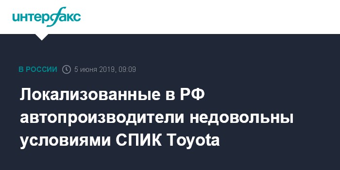 Москва. 5 июня. INTERFAX.RU - Автопроизводители, локализовавшие свое производство в РФ, остались недовольны условиями, на которых японская Toyota смогла согласовать свой специнвестконтракт (СПИК).