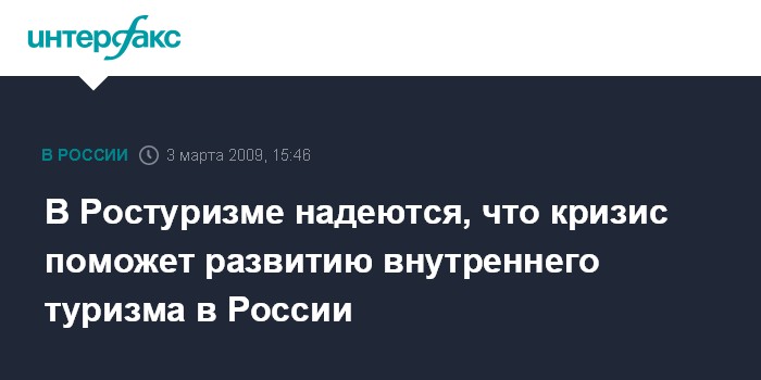 Москва. 3 марта. INTERFAX.RU - Глобальный финансово-экономический кризис открывает новые возможности для развития внутреннего туризма в России, заявил на пресс-конференции во вторник заместитель руководителя Федерального агентства по туризму (Ростуризм) Евгений Писаревский.