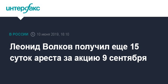 Москва. 10 июня. INTERFAX.RU - Глава штаба оппозиционера Алексея Навального Леонид Волков получил 15 суток административного ареста за нарушение при организации акции против повышения пенсионного возраста 9 сентября 2018 года в Петербурге. Об этом "Интерфаксу" сообщили в пресс-службе Тверского суда Москвы.