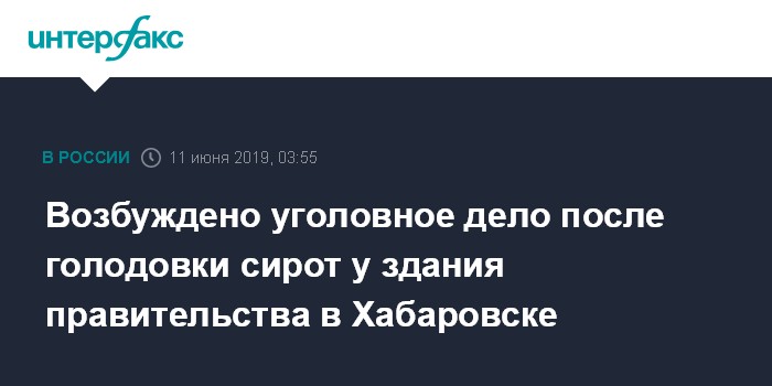 Как сообщалось ранее, группа бывших воспитанников детских домов начала голодовку у здания правительства 3 июня. Они требовали у властей положенное им по закону жилье. Губернатор Хабаровского края Сергей Фургал дважды лично встречался с активистами. По его словам, в 2019 году для детей-сирот в Хабаровском крае будет построено 580 квартир. Протестующим на площади были предложены варианты временного размещения в краевых общежитиях, после чего они прекратили свою акцию.