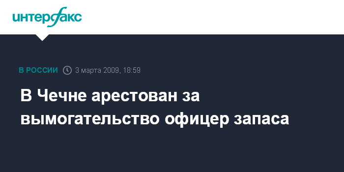 Грозный. 3 марта. INTERFAX.RU - В Чечне за вымогательство денег в особо крупном размере взят под стражу полковник запаса внутренних войск, сообщили во вторник "Интерфаксу" в пресс-службе МВД по Чеченской республике.