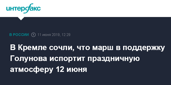 Москва. 11 июня. INTERFAX.RU - В Кремле сочли, что марши в поддержку Ивана Голунова, запланированные в Москве и других городах 12 июня, могут воспрепятствовать праздничной атмосфере в День России.