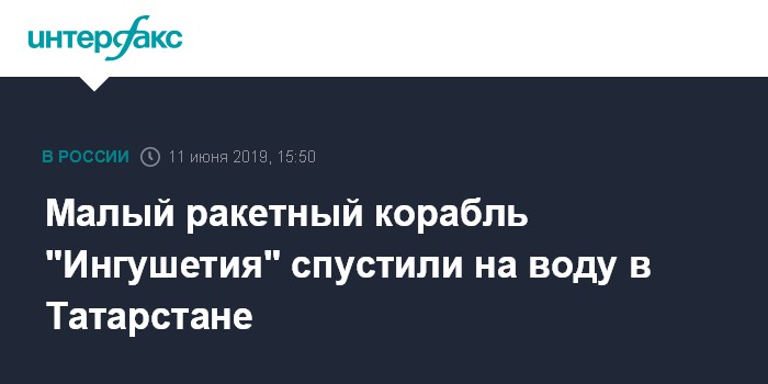 Москва. 11 июня. INTERFAX.RU - Малый ракетный корабль проекта 21631 "Ингушетия" во вторник торжественно спущен на воду на Зеленодольском заводе в Татарстане. Об этом сообщили агентству "Интерфакс" в пресс-службе главы Ингушетии.