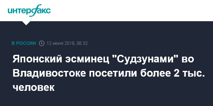 "Эсминец "Судзунами" 11 и 12 июня открыт для посещения жителями и гостями Владивостока. За этот период на корабле уже побывало более 2 тыс. посетителей", - сообщила в среду пресс-служба Тихоокеанского флота.