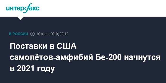 Москва. 18 июня. INTERFAX.RU - Россия планирует начать поставки в США самолётов-амфибий Бе-200 в 2021 году, сообщил журналистам гендиректор компании-разработчика ТАНТК имени Бериева Юрий Грудинин.