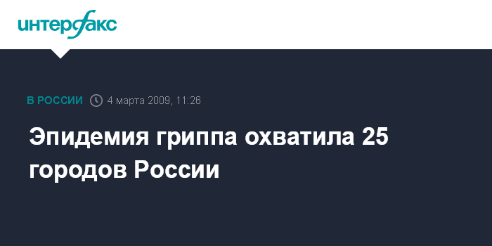 Москва. 4 марта. INTERFAX.RU – Эпидемия гриппа зарегистрирована в 25 российских городах и трех субъектах федерации, сообщили "Интерфаксу" в среду в Роспотребнадзоре. "Заболеваемость гриппом и ОРВИ, превышающая эпидемические пороги среди совокупного населения зарегистрирована в 25 городах и трех субъектах РФ", - отмечается в пресс-релизе Роспотребнадзора, поступившем в среду в "Интерфакс".