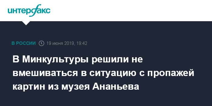 Москва. 19 июня. INTERFAX.RU - Министерство культуры РФ не будет вмешиваться в ситуацию с пропажей арестованных судом картины из музея экс-совладельца Промсвязьбанка Алексея Ананьева, которые исчезли из хранилища Института русского реалистического искусства (ИРРИ).