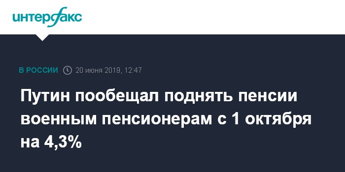 Москва. 20 июня. INTERFAX.RU - Военным пенсионерам с 1 октября этого года будут повышены пенсии на 4,3%, сообщил президент РФ Владимир Путин в четверг в ходе "прямой линии".