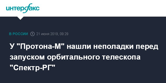 Москва. 21 июня. INTERFAX.RU - Запуск на орбиту космического телескопа "Спектр-РГ" перенесли с 21 на 22 июня из-за неполадок у ракеты-носителя "Протон-М". Выявленная проблема не критична, ее быстро устранят, сообщили "Интерфаксу" в пресс-службе "Роскосмоса".