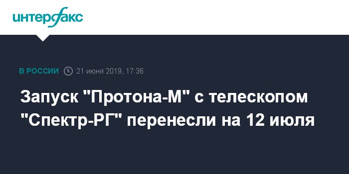 Москва. 21 июня. INTERFAX.RU - Запуск ракеты-носителя "Протон-М" с космической обсерваторией "Спектр-РГ" перенесен на второе стартовое окно - 12 июля. Об этом сообщил журналистам замгендиректора "Роскосмоса" по космическим комплексам и системам Михаил Хайлов.