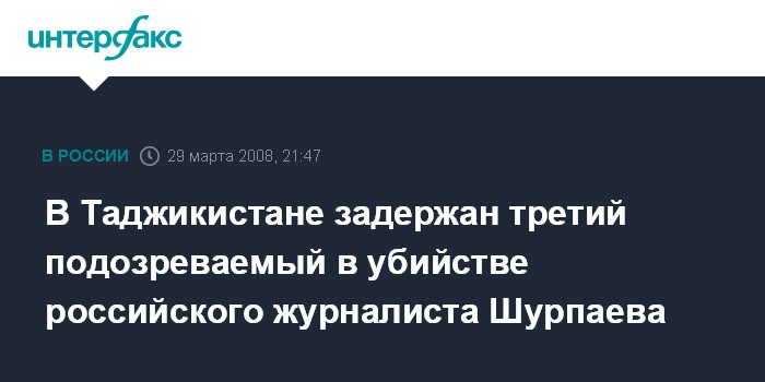 Душанбе. 29 марта. ИНТЕРФАКС - Третий подозреваемый в убийстве корреспондента российского Первого телеканала Ильяса Шурпаева задержан в субботу вечером в Таджикистане, сообщил "Интерфаксу" начальник штаба МВД республики Хайдар Махмадиев.