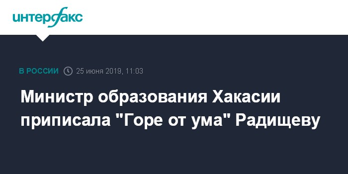 Москва. 25 июня. INTERFAX.RU - Министр образования Хакасии Лариса Гимазутина в телеэфире сказала, что "Горе от ума" написал Александр Радищев. В пресс-центре ее ведомства оговорку объяснили усталостью министра.