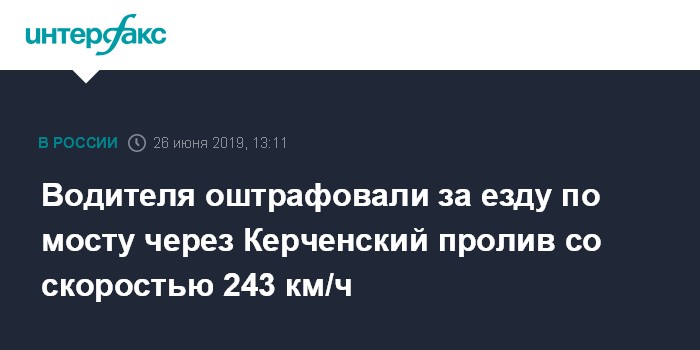 Москва. 26 июня. INTERFAX.RU - На Крымском мосту через Керченский пролив водитель BMW разогнался до скорости 243 км/ч. Это максимальная скорость, зафиксированная на этом мосту сотрудниками ГИБДД, сообщил начальник центра фиксации правонарушений регионального ГИБДД Дмитрий Леонтьев.