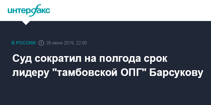 Москва. 26 июня. INTERFAX.RU - Городской суд Санкт-Петербурга сократил на полгода срок лишения свободы лидеру "тамбовской" организованной преступной группировки Владимиру Барсукову (Кумарину) и его подельнику Вячеславу Дрокову. Об этом сообщил адвокат Барсукова Константин Кузьминых.