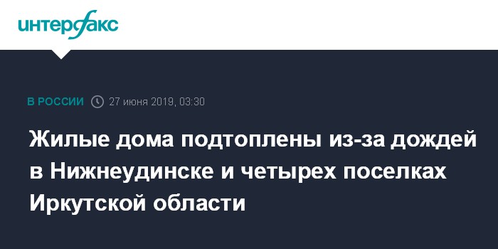 Москва. 27 июня. INTERFAX.RU - Жилые дома подтоплены в пяти населенных пунктах Тайшетского и Нижнеудинского района Иркутской области из-за резкого подъема воды в реках после продолжительных сильных дождей, сообщает пресс-служба Главного управления МЧС по региону.