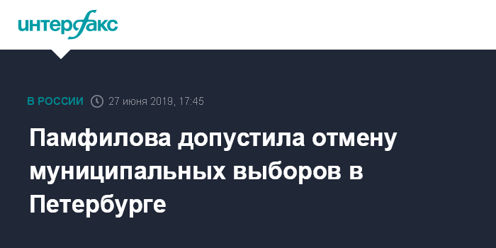 Москва. 27 июня. INTERFAX.RU - Глава Центризбиркома Элла Памфилова не исключила возможности отмены муниципальных выборов в Санкт-Петербурге.