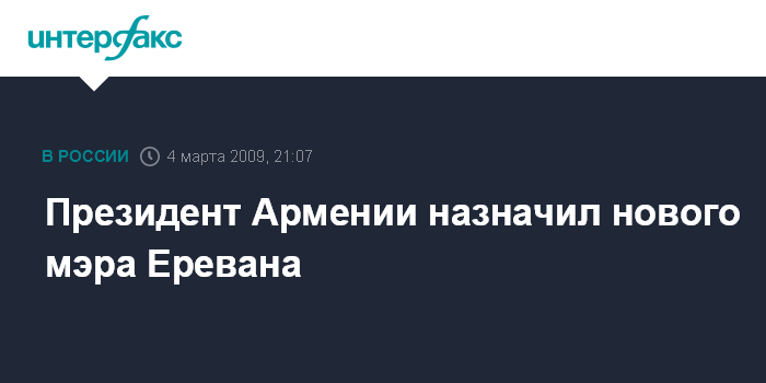 Ереван. 4 марта. INTERFAX.RU - Указом президента Армении Сержа Саргсяна Гагик Бегларян назначен на пост мэра столицы республики, города Еревана.