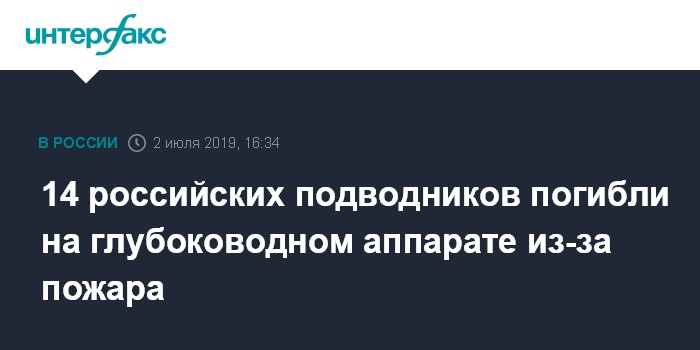 "1 июля в российских территориальных водах на научно-исследовательском глубоководном аппарате, предназначенном для изучения придонного пространства и дна Мирового океана в интересах Военно-Морского Флота России, в ходе проведения батиметрических измерений (оценка глубин водных объектов с помощью специального оборудования - ИФ) возник пожар. 14 моряков-подводников погибли в результате отравления продуктами горения", - заявили в Минобороны РФ.