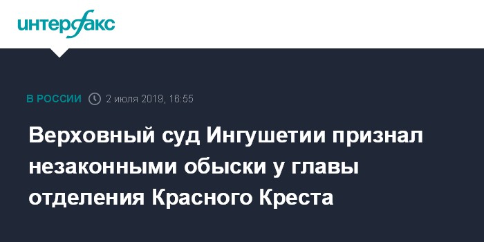 Москва. 2 июля. INTERFAX.RU - Верховный суд Ингушетии счел незаконными обыски, которые прошли в апреле дома у главы ингушского отделения "Российского Красного креста" (РКК), одного из лидеров протестов против соглашения о границе с Чечней Мусы Мальсагова в Назрани. Об этом сообщил представитель суда.