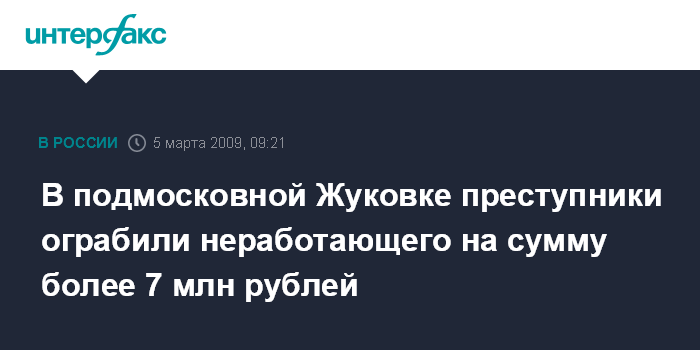 Москва. 5 марта. INTERFAX.RU - Ограбление неработающего местного жителя совершено в деревне Жуковка-3 Одинцовского района Московской области, сообщил "Интерфаксу" в пятницу источник в правоохранительных органах.
